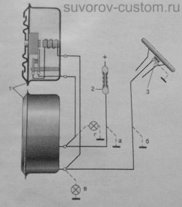 1 — сигналы, 2 — предохранители, 3 — выключатель: а — б это вероятные касания (замыкания проводов на массу (кузов либо раму). в — г это места подключения контрольной лампочки при испытаниях.