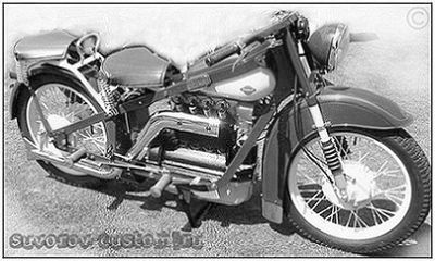 Первой такую конструкцию применила датская компания Nimbus ещё в 1919 году, на своём мотоцикле, продемонстрированном на фото слева.